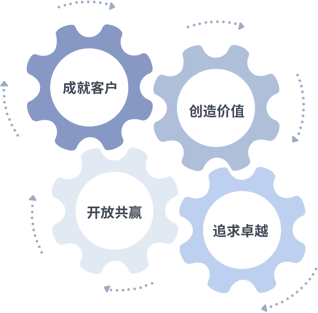 成就客户是一切决策的出发点,,创造价值是衡量所有工作的标准,,,,追求卓越是我们做事做人的态度,,,开放共赢是我们的格局也是最终的结果。。。。价值观的齿轮环环相扣,,,,推动着组织里的每个人不断向前。。。